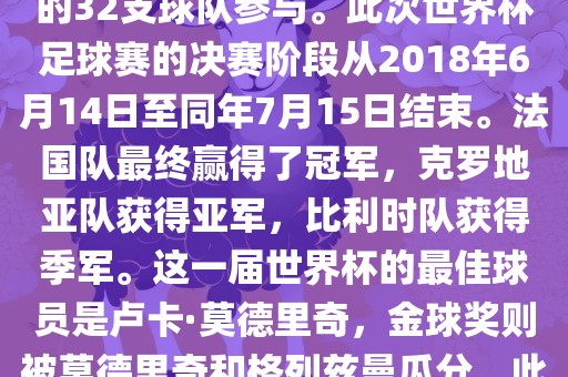 摘要:2018年俄罗斯世界杯是第21届足球赛事,全球32支球队参与。法国队赢得冠军,克罗地亚和比利时分别获得亚军和季军。最佳球员为卢卡·莫德里奇,金球奖被莫德里奇和格列兹曼分享。该届世界杯创造了多项纪录和亮点,观众人数创新高。