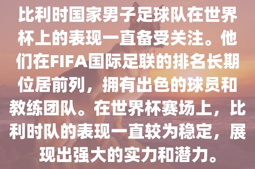 比利时国家男子足球队在世界杯上是一支备受关注的球队,他们拥有强大的实力和潜力,始终在比赛中展现出出色的表现,他们仍将是世界杯赛场上的重要竞争者之一。