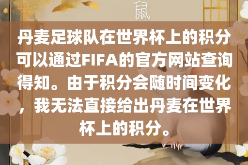 丹麦足球队在世界杯上的积分可以通过FIFA的官方网站查询得知。由于积分会随时间变化,我无法直接给出丹麦在世界杯上的积分。
