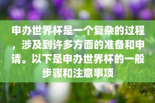 申办世界杯是一个复杂的过程,涉及到许多方面的准备和申请。以下是申办世界杯的一般步骤和注意事项