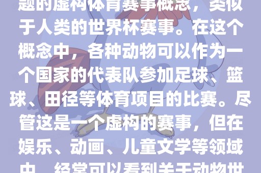 动物世界杯是一个以动物为主题的虚构体育赛事概念,类似于人类的世界杯赛事。在这个概念中,各种动物可以作为一个国家的代表队参加足球、篮球、田径等体育项目的比赛。尽管这是一个虚构的赛事,但在娱乐、动画、儿童文学等领域中,经常可以看到关于动物世界杯的故事和情节。