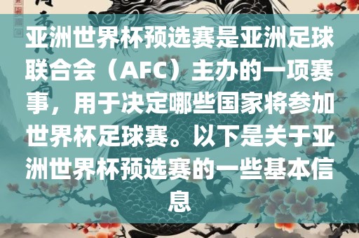 亚洲世界杯预选赛是亚洲足球联合会(AFC)主办的一项赛事,用于决定哪些国家将参加世界杯足球赛。以下是关于亚洲世界杯预选赛的一些基本信息