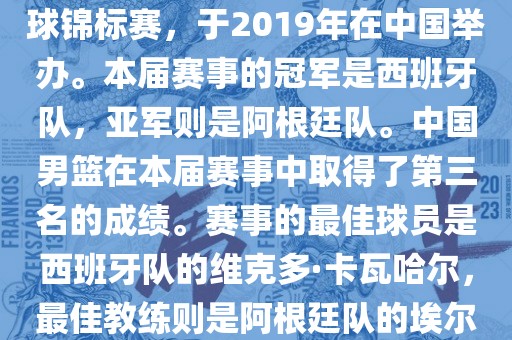 摘要:2019年国际篮联篮球世界杯在中国举办,西班牙队夺得冠军,中国男篮取得第三名。最佳球员为西班牙队的维克多·卡瓦哈尔,最佳教练为阿根廷队的埃尔南多·贝拉斯科。本届赛事创造了多项纪录,包括观众人数超过全球电视观众人数等。