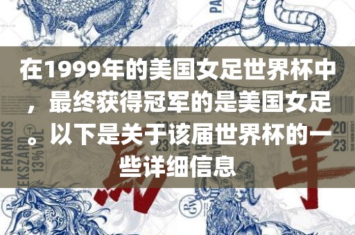 在1999年的美国女足世界杯中,最终获得冠军的是美国女足。以下是关于该届世界杯的一些详细信息