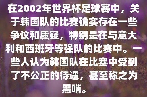 在2002年世界杯足球赛中,关于韩国队的比赛确实存在一些争议和质疑,特别是在与意大利和西班牙等强队的比赛中。一些人认为韩国队在比赛中受到了不公正的待遇,甚至称之为黑哨。
