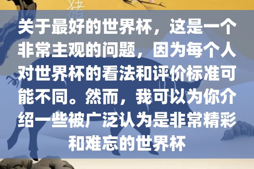 关于最好的世界杯,这是一个非常主观的问题,因为每个人对世界杯的看法和评价标准可能不同。然而,我可以为你介绍一些被广泛认为是非常精彩和难忘的世界杯