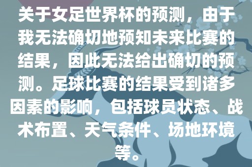 关于女足世界杯的预测,由于我无法确切地预知未来比赛的结果,因此无法给出确切的预测。足球比赛的结果受到诸多因素的影响,包括球员状态、战术布置、天气条件、场地环境等。