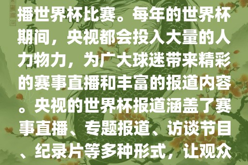 央视作为世界杯赛事的重要转播媒体,每年世界杯期间都会投入大量资源,为广大球迷带来精彩的赛事直播和丰富的报道。报道形式包括赛事直播、专题报道、访谈节目和纪录片等,让观众全面了解世界杯背后的故事和瞬间。