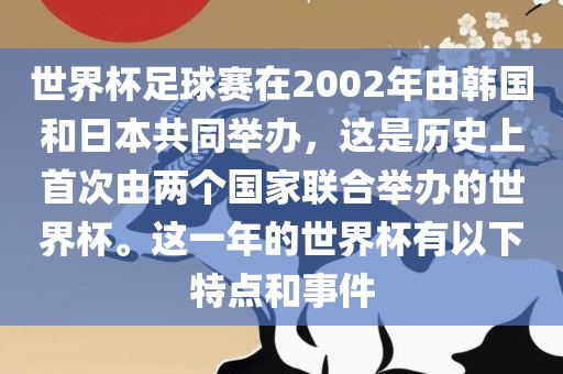 世界杯足球赛在2002年由韩国和日本共同举办,这是历史上首次由两个国家联合举办的世界杯。这一年的世界杯有以下特点和事件