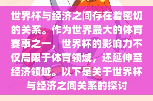 世界杯与经济之间存在着密切的关系。作为世界最大的体育赛事之一,世界杯的影响力不仅局限于体育领域,还延伸至经济领域。以下是关于世界杯与经济之间关系的探讨