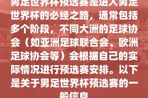 男足世界杯预选赛是进入男足世界杯的必经之路,通常包括多个阶段,不同大洲的足球协会(如亚洲足球联合会、欧洲足球协会等)会根据自己的实际情况进行预选赛安排。以下是关于男足世界杯预选赛的一般信息