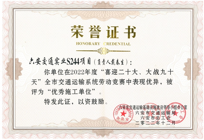 近日,公司在六安市交通運(yùn)輸局和六安市總工會(huì)組織的“喜迎二十大、大戰(zhàn)九十天”全市交通運(yùn)輸系統(tǒng)勞動(dòng)競(jìng)賽綜合考評(píng)中獲第一。同時(shí)參與建設(shè)的S244羅崗至分路口段公路工程(二期)03合同段項(xiàng)目和G237六安馬頭至舒城萬佛湖工程(一期)項(xiàng)目在勞動(dòng)競(jìng)賽中被評(píng)為“優(yōu)秀施工單位”。