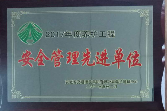 2017年12月14日,2017年度瀝青路面養(yǎng)護(hù)工程交工驗收暨總結(jié)表彰大會在合肥召開,六安市交通公路實業(yè)有限公司2017-2019年度安徽省部分高速公路瀝青路面專項養(yǎng)護(hù)工程03標(biāo)項目經(jīng)理部榮獲2017年度養(yǎng)護(hù)工程”優(yōu)秀項目部“和”安全管理先進(jìn)單位“稱號。