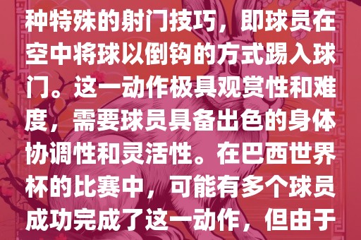在巴西世界杯中,倒挂金钩是一个非常精彩且震撼的射门动作。这一术语通常用来描述一种特殊的射门技巧,即球员在空中将球以倒钩的方式踢入球门。这一动作极具观赏性和难度,需要球员具备出色的身体协调性和灵活性。在巴西世界杯的比赛中,可能有多个球员成功完成了这一动作,但由于比赛场次众多,具体是哪位球员以及具体哪场比赛完成的这一动作可能难以准确回忆。