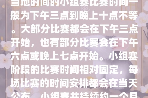 小组赛阶段从第1轮至第9轮进行,比赛时间通常在下午三点至晚上十点之间。比赛时间相对固定,每场安排都会在当天公布。小组赛持续约一个月,大部分比赛在下午三点开始,也有部分比赛在其他时间开始。这一阶段的比赛对于参赛队伍来说至关重要,将决定他们在后续比赛中的排名和晋级机会。
