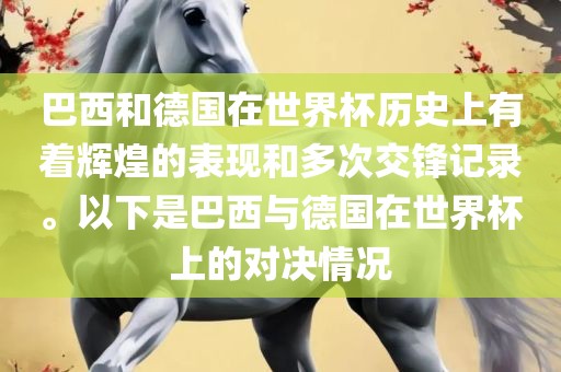 巴西和德国在世界杯历史上有着辉煌的表现和多次交锋记录。以下是巴西与德国在世界杯上的对决情况