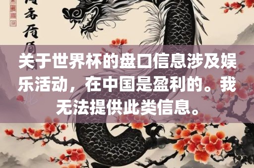 关于世界杯盘口信息的摘要如下:,,涉及世界杯盘口信息的娱乐活动具有盈利性质。我无法提供此类信息。这类信息涉及娱乐活动,可能违反法律法规,并带来财务风险。请广大球迷谨慎参与相关活动,遵守法律法规,理性对待足球赛事。