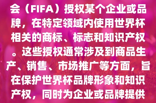 世界杯授权是指国际足球联合会授权特定企业或品牌使用世界杯相关商标、标志和知识产权的行为。这种授权涉及商品生产、销售、市场推广等领域,旨在保护世界杯品牌形象和知识产权,同时为企业或品牌提供合法的商业机会。授权有助于确保世界杯相关知识产权得到合法使用,并促进相关产业的发展。