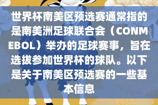 世界杯南美区预选赛通常指的是南美洲足球联合会(CONMEBOL)举办的足球赛事,旨在选拔参加世界杯的球队。以下是关于南美区预选赛的一些基本信息
