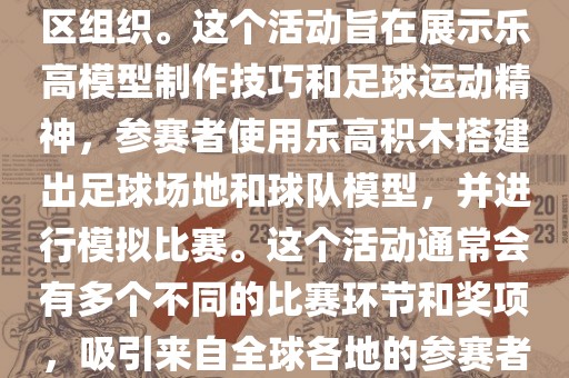 具体的活动安排和规则可能会因组织者和年份而异,建议关注相关社区或官方渠道以获取最新信息,乐高公司本身也可能推出与足球或世界杯相关的乐高套装或模型,供爱好者们收藏和展示。