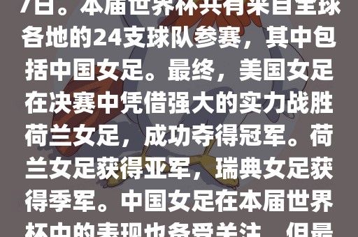摘要:2019年女足世界杯在法国举行,是首次在欧洲举办的世界杯。比赛时间为一个月,共有来自全球各地的24支球队参赛,包括中国女足。美国女足夺冠,荷兰和瑞典分别获得亚军和季军。中国女足表现备受关注但未进八强。本届世界杯还创造了多项纪录和亮点。
