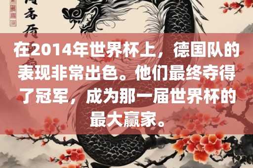 德国队在2014年世界杯上表现出色,最终夺得冠军,成为该届赛事的最大赢家。他们在比赛中的表现令人印象深刻,充分展现了实力和战术素养。这一成就让德国队在足球世界中再次崭露头角。